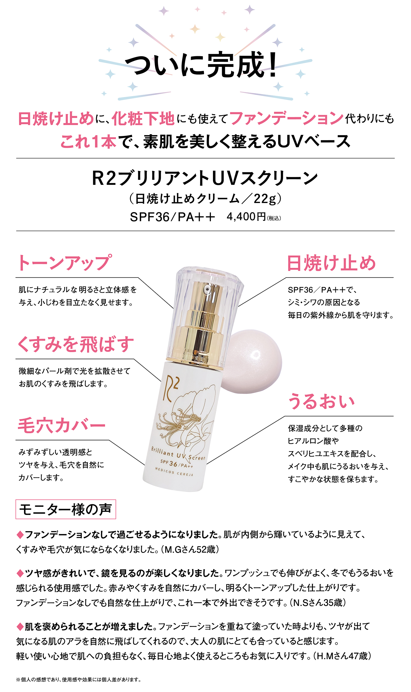☆肌にナチュラルな明るさ(トーンアップ)と立体感を与え、小じわを目立たなく見せます。